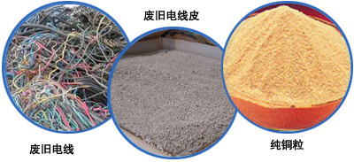 2、先把电线破碎成的粒状,再把破碎铜粒自动流入电线铜粉分离震动筛网过滤,最后,做出了铜粒,塑料,电线皮分离效果。